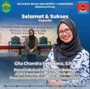 Guru Matematika SMA Negeri 1 Kota Samarinda, Ibu Gita Chandra Febriliana, S.Pd berhasil meraih penghargaan sebagai Penulis Buku berbagi Praktik Baik Etam Kayuh Bebaya yang di naungi oleh Dinas Provinsi Kalimantan Timur tahun 2025.