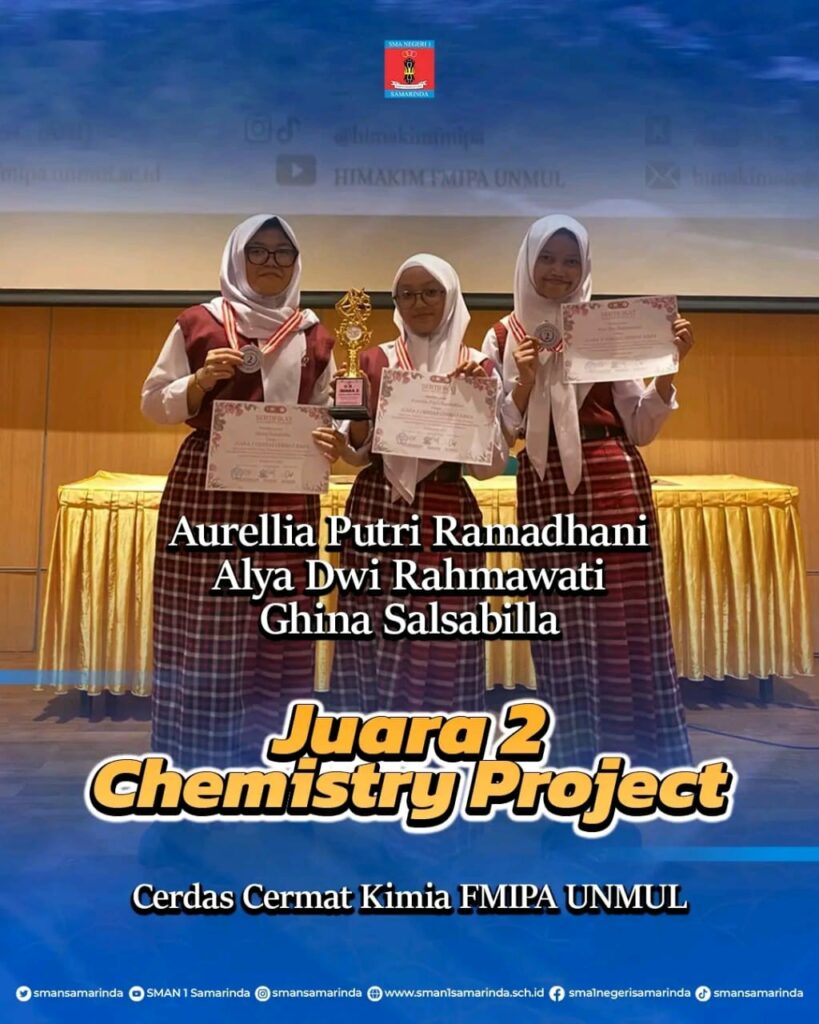 Samarinda, 1 Oktober 2025 — Aurellia Putri Ramadhani, Alya Dwi Rahmawati, dan Ghina Salsabilla meraih Juara 2 kategori Chemistry Project dalam ajang Cerdas Cermat Kimia di Fakultas MIPA Universitas Mulawarman pada September 2025.