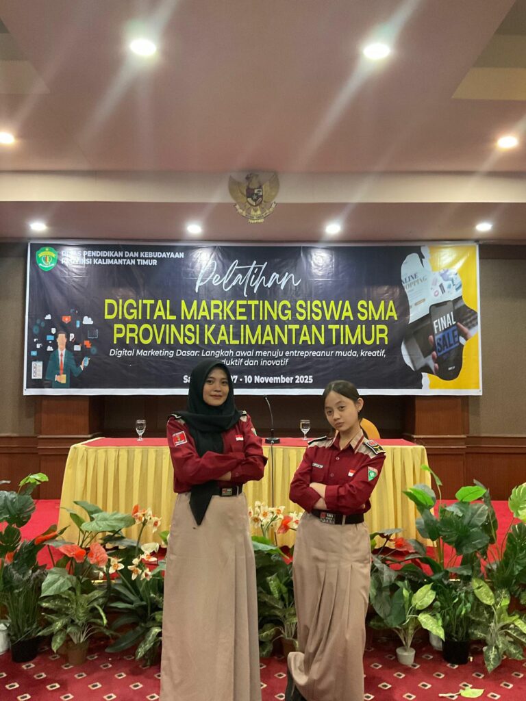 Samarinda, 11 November 2025 — Dua siswa SMA Negeri 1 Samarinda, yaitu Ailsya Ernika Azzahra dan Maria Sayling, mengikuti kegiatan Pelatihan Digital Marketing untuk Sekolah Menengah Atas Negeri dan Swasta Provinsi Kalimantan Timur Tahun 2025