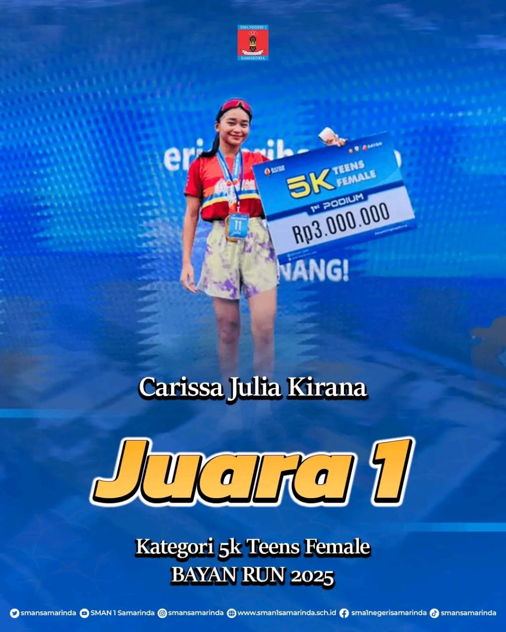 Samarinda, 12 Oktober 2025 — Prestasi membanggakan kembali diraih oleh siswi SMA Negeri 1 Samarinda. Carissa Julia Kirana sukses meraih Juara 1 Kategori 5K Teens Female dalam ajang Bayan RUN 2025, sebuah lomba lari tingkat nasional yang digelar di Kota Balikpapan